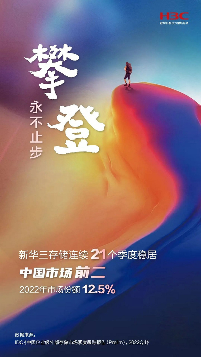 近日,IDC发布《中国企业级外部存储市场季度跟踪报告(Prelim),2022Q4》。报告显示,2022年第四季度紫光股份旗下新华三集团以11.9%的市场份额位列中国企业级外部存储市场第二,2022年全年新华三中国存储市场份额达12.5%。截止目前,新华三存储已连续21个季度稳居中国市场前二,充分彰显了新华三在存储领域的绝对产品优势以及市场的高度认可。