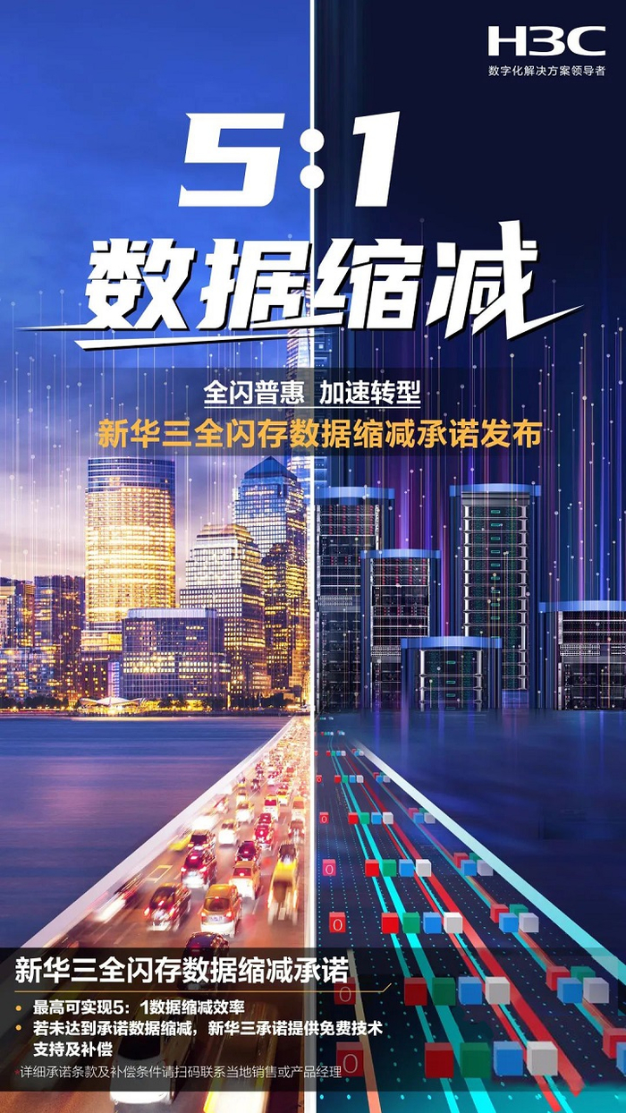 眼下,随着行业用户对存储平台性能要求的日益提升,全闪存正在成为越来越多企业数字化转型的首选。除了推出业内首款NVMe+SCM分布式全闪节点H3C UniStor X10828,新华三集团还推出了“全闪存数据缩减保障”承诺计划,在连接智能管理运维平台InfoSight和数据服务控制平台DSCC的条件下,能为全闪存用户提供业界最高5:1的数据效率,显著提升全闪存阵列的管理效率,进一步降低部署成本。