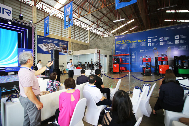 在现场,为了让嘉宾更好的感受无人叉车的性能与应用情况,特意布置了“动态演示区”与“静态展示区”,让泰国的领导与客户们更深切的了解镭神智能激光雷达3D SLAM无人叉车其自然定位导航、全方位3D安全防护及智能搬运能力。