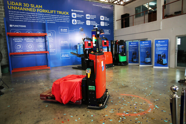 开业仪式的领导发言结束后,接下来就是万众期待的新品发布环节,各位领导带着激动的心情,上台共同揭晓这款重磅产品,这也意味着镭神智能激光雷达3D SLAM无人叉车正式在泰国亮相!