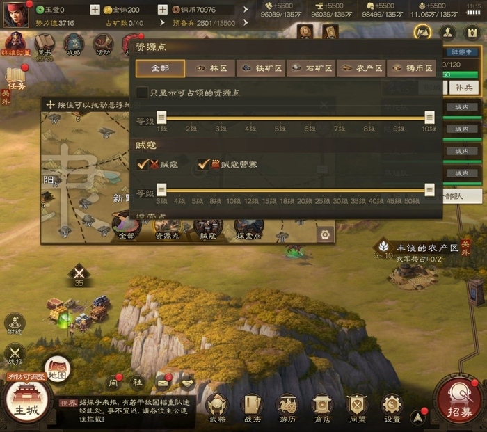 3. 高效调兵遣将。游戏中后期GVG阶段,小地图会承载同盟玩法的重要信息展示,参与同盟玩法的玩家可点击小地图及时查看相关信息,例如同盟进攻路线、城池攻打情况等等。小地图不仅能方便玩家查看对局信息,而且还能根据对应信息直接在小地图上调兵遣将。开天眼般的上帝视角,用户将决胜千里之外。