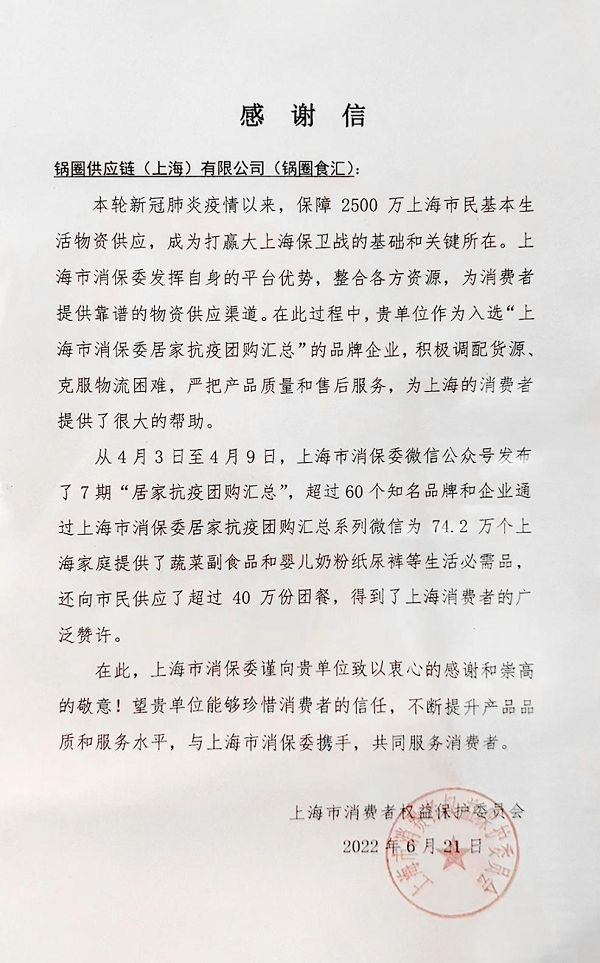 让张阿姨印象深刻的上海抗疫,也让更多上海人认识了锅圈这家企业的价值。据了解,去年3月上海疫情发生后,作为重点保供企业之一,锅圈一直坚持保供应、保运营、保安全行动,保持“平价售货”,通过提供抗疫团购套餐、第一时间慰问关怀奋战一线的抗疫人员等方式,打响民生品牌的抗疫保供战。