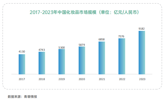 《中国化妆品行业斑马鱼技术应用白皮书》指出,2016~2022年,中国化妆品市场规模呈现持续增长态势,预测2023年将达到9182亿元,其中,护肤品市场份额为4230亿元,是彩妆市场的近三倍。