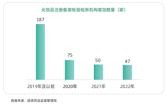 但值得注意的是,化妆品功效检测市场规模的增长并非雨露均沾,尽管新规落地,行业内普遍认为是对检测机构的利好,药监局官方数据显示注册备案的机构数量呈增长趋势。但截至2022年底,国家药监局官网公示的化妆品注册和备案检验检测机构合计359家,2022年仅新增47家,机构数量增长放缓。