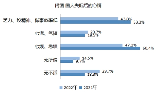 《中国睡眠研究报告2023》报告指出,47.2%的民众失眠后会心烦、急躁,43.8%的民众认为失眠后会乏力、没精神、做事效率低,失眠影响着人们的身体健康与生活状态。