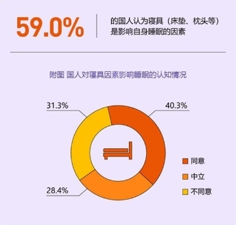 此外,舒适的睡眠环境也很重要。《中国睡眠研究报告2023》指出,在影响睡眠质量的诸多外部因素中,59%的受访者认为寝具因素,如床垫、枕头、被子等是直接影响睡眠质量的因素,因此好的睡眠离不开好的床品。