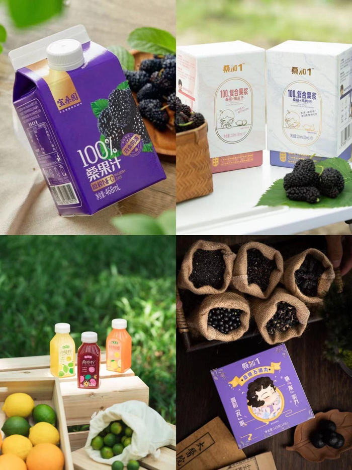 中禾宝桑旗下品牌宝桑园定位品质高端,聚焦国人健康需求,研发出100%桑果汁、桑葚果干、100%复合果汁、桑果酒等产品,还原桑葚的“一百种”美味吃法。植然乐坚持“来自植物的畅快轻盈”,产品配料表仅有果蔬汁、水、维生素,果汁含量达99%,补充人体日常所需VC,有助提高身体免疫力。桑加1推出100%复合果浆、桑葚五黑丸等产品,以桑加1「100%复合果浆」为例,将桑葚分别复配黑枸杞、覆盆子,打造两种口味的高颜值饮品,兼顾健康美味与食用便捷。