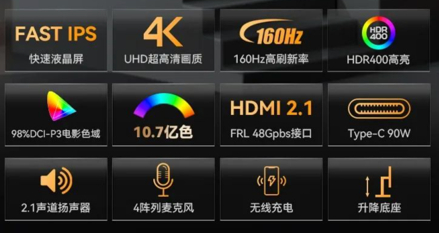 泰坦军团M27E2V这款分辨率高达4K的电竞显示器。不仅拥有高达160Hz的高刷新率,而且在Fast IPS面板的加持下,还提供了低至1ms的GTG灰阶响应时间,无论是多么硬核的电竞游戏都能清晰又流畅的呈现。高达98%的DCI-P3色域覆盖,加上每台显示器的出厂校色工序,让玩家提供了震撼、真实的画面效果,搭配显示器自带的震撼立体声音响,让玩家全方位的沉浸在游戏世界中。显示器除了提供了两个满血HDMI 2.1接口,用于实现4K 160Hz高规格画面传输以外,还提供了90W供电功率的TYPE-C接口,让电竞玩家畅连笔记本电脑、手机、平板等移动设备。同时,这款显示器还支持15W的无线充电功能,只要将支持无线充电的手机放在显示器底座上,玩电脑的同时,让手机也满血复活。这款显示器,不仅很适合游戏,影音用户的使用,而且在作图,影音剪辑等场合也能很好的发挥出其优势。