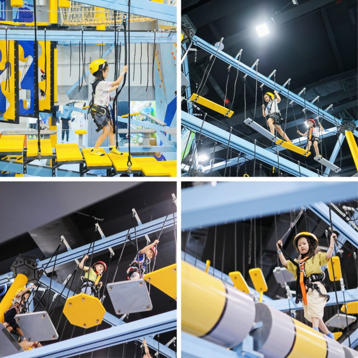 空中挑战:挑战不一样的关卡,考验平衡力和意志力,孩子创造挑战自我、克服恐惧、建立自信的良好机会。