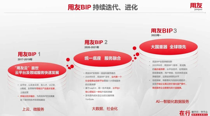 继财务软件、ERP软件的成功创新之后,七年前用友战略投入规模研发打造的全新一代服务企业数智化的产品——用友BIP,历经预研、原型产品、小规模客户验证、功能完善与跨行业规模化应用的发展历程,从BIP1、BIP2到BIP3,七年磨一剑,在平台技术与应用架构、领域与行业应用、生态体系三个层面,实现全面突破,达到全球领先水平。