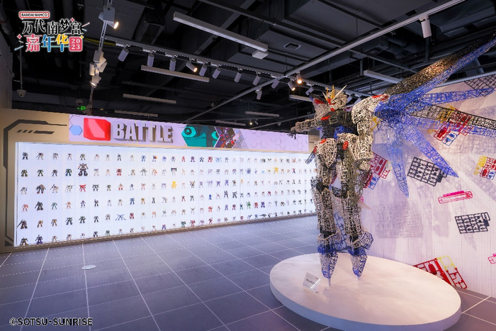 一整面的高达模型展示墙和流道自由高达立像,让观众瞬间来到了高达的世界。在这里陈列了琳琅满目的高达商品,观众还可在此区域预约《高达联合行动》手游并获得限量纪念徽章。
