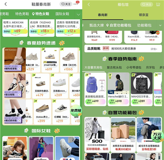鞋靴馆也针对不同人群的消费需求,在户外出游、职场通勤、银发孝老等不同专区主推红蜻蜓舒适商务皮鞋、足力健春季轻便散步鞋等。考虑到今年旅游市场回暖,箱包馆为消费者带来度假风的CHARLES&KEITH沙滩包、明星博主同款个乐新月包,以及前开盖、侧收纳的皇冠多功能行李箱等趋势好物。