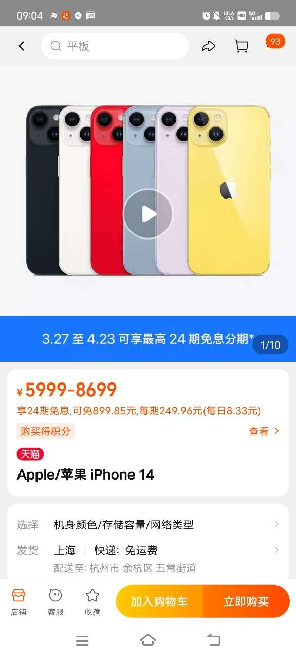 这是时隔三年,天猫苹果官方旗舰店再推日常花呗24期免息活动,预计将极大推动苹果手机的换机潮。记者登录天猫Apple Store 官方旗舰店,显示目前四款机型货源充足。iPhone 14和iPhone 14 Plus均拥有蓝色、紫色、黄色、午夜色、星光色、红色六种颜色,根据内存卡容量不同(128GB至512GB),iPhone 14价格区间为5999元至8699元,iPhone 14 Plus价格区间为6999元至9699元。