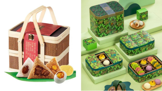 礼盒内容物配置上,品牌常以不同口味的粽子搭配绿豆糕、海鸭蛋销售,经典端午三宝组合一应俱全,对于企业团购、商务送礼来说不失为一个好选择,如五芳斋的韵味五芳礼篮。而锦华礼的粽享盛宴礼盒,更组合搭配乳酪酥、彩虹糕等多种创新口味的中式糕点,精致且美味,不仅兼顾了“咸甜之争”的南北喜好,更能满足消费者的多样需求,为端午带来了更多的新鲜感及选择。而礼盒造型、包装上,品牌更是费尽心思,个性定制礼盒不但要求新颖有创意,还要精致有新意。在这个“拼颜值”的时代,只有多样化、趣味化才能让产品在端午节市场上脱颖而出。