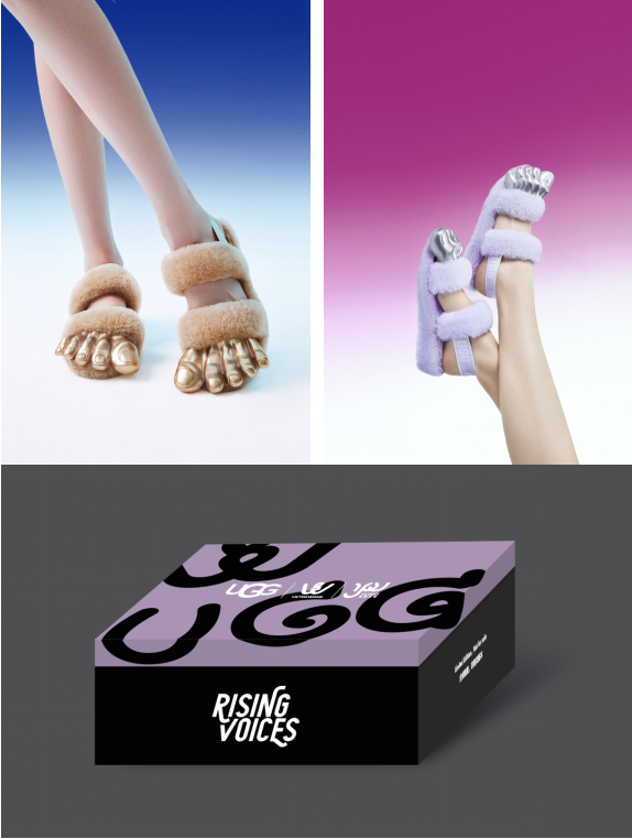 Stephen Bayley的一句话 "美和丑不是对立的,而是同一事物的各个方面 "引起了Wong的共鸣,他认为Z世代的成长开启了一个非标准化的 "美学 "新时代。"我们不需要遵循其他人对美的定义。我们可以跟随我们的心去了解自己,鼓励自己,爱自己。做到这一点,美就会由内而外散发出来。我们可以是懒惰的、酷的、可爱的或搞怪的。我们敢于做自己。我们的美是有趣的、有活力的和多样化的。对我来说,所有这些情感都呼应了UGG®品牌的核心价值,即大胆、激情、自由、乐观和真实--我希望所有这些都能在我的设计RISING VOICES中得到表达。"