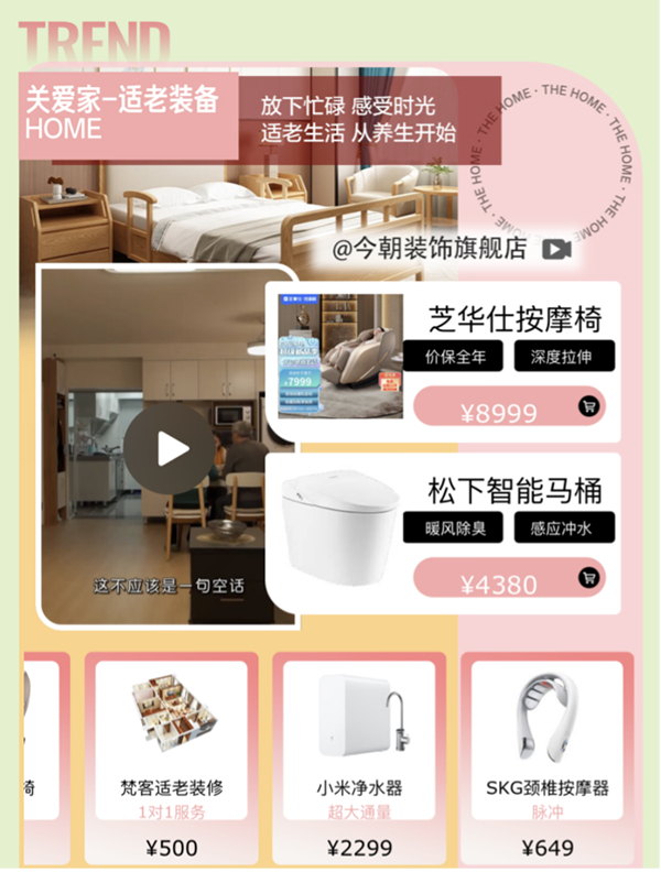 家代表着每个人的气质,也装着每个人的喜好。在“个性家”场景中,有运动毛巾、瑜伽垫、星巴克吨吨壶、索尼游戏电视、傲风电竞椅、柔软的林氏家居单人沙发等等。无论是喜爱运动、美食、阅读或是娱乐休闲,在“个性家”的场景里,都能找到共鸣。在“治愈家”场景里,硅胶皮沙发、戴森吸尘器、德龙咖啡机,为自己冲上一杯香浓咖啡,或是用手抓壶茶具泡上一壶清茶,缓解工作压力,细细感受生活的静逸。为家人创造温馨舒适的生活环境是每个人内心最深的期待。在“关爱家”场景中,囊括了儿童学习桌、儿童床、洗手机、身高贴、保温杯、电动牙刷等一系列儿童所能用到的家电、家居产品;还有芝华仕按摩椅、智能马桶、养生壶、智能床垫、止鼾枕等适老产品。
