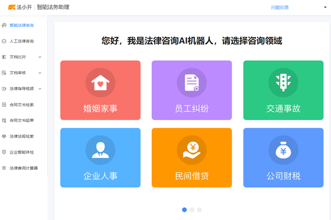 法小开智能法务基于AI技术,为用户提供便捷、精准的法律咨询服务。它能够在劳动、婚姻、交通、借贷等14个领域提供智能法律咨询,解答上万条常见法律问题。