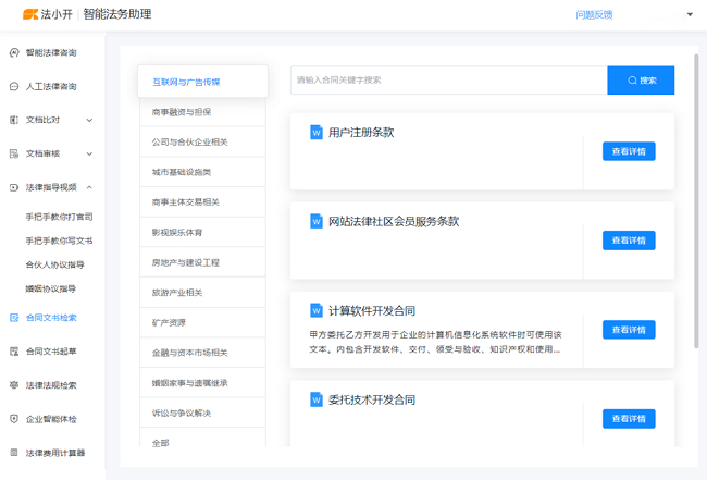 法小开的合同智能比对功能能够一秒实现全面智能比对,基于自然语言处理NLP、光学字符识别OCR技术,识别不同格式文档,自动读取内容,比较差异。智能合同审核还能够自动识别合同中不规范和缺失的条款,列出风险,并一键修改为规范合同。合同智能比对和智能审核用AI代替人工阅读大量枯燥文本,能够减少重复劳动,提高人们的工作效率。法小开还提供合同模板下载和智能起草,权威、专业的数据库提前预设覆盖20类领域的标准文档模板,提供快速起草文档框架,同时,通过人工智能和大数据,辅助修改合同条约,形成定制合同。