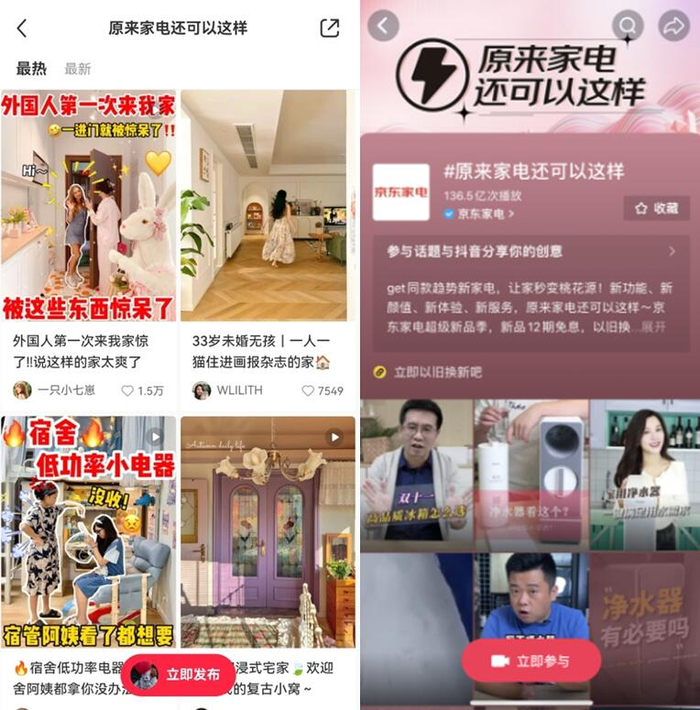 同时,在与消费者沟通的层面上,京东家电也展现出了新动作。当下80、90后已成为家电消费的中流砥柱,与前辈相比,他们更“懒”——愿意穷尽一切办法获得“家务自由”,更“挑剔”——从审美设计、高效节能到个性化功能设置必须360°无死角,更“爱憎分明”——无论是种草还是避雷都能写成一段令人拍案的脱口秀,在分享平台不是在“仗义执言”,就是在“一键三连”。对此,京东家电选择迎难而上,在小红书与抖音这两个年轻人分享日常生活的平台上推出“原来家电还可以这样”话题,并协同九大品牌进行内容共建。该话题创建后迅速吸聚平台人气,在不断地转发、收藏中获得大量关注:在本次新品季期间,小红书话题阅读量1.5亿+,抖音话题阅读量达136.5亿,充分展示了集颜值、智能、绿色、多功能于一身的新一代家电产品的风采。消费者也在“原来家电还可以这样”的频频惊叹中,发现“原来生活还可以这样”。在这个快节奏的时代,新品家电无疑很大程度上解放了人们的双手,使人们能够从繁琐枯燥又耗时的家务中顺利脱身,更轻松自由地享受美好生活,去探索生活的更多可能性。