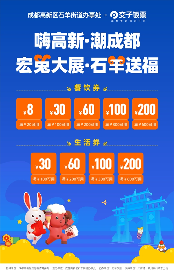 据悉,本次活动由成都高新区国际合作商务局指导,成都高新区石羊街道办事处主办,交子饭票协办,通过“交子饭票”微信小程序/APP统一发放本轮消费券。3月28日至4月30日每天上午10点准时发放,当日抢完即止,次日10点更新,采取“先用先得”的方式,消费者领取后7日内如未使用则自动失效。