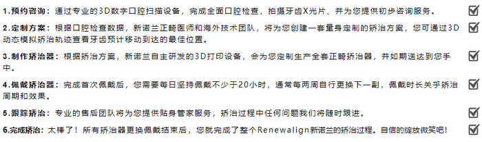 所以,选择Renewalign新诺兰,轻松6步,就能享受舒适的悄然变美过程。如果你刚好想做牙齿矫正,不妨扫码和我们的微信客服聊一聊吧!