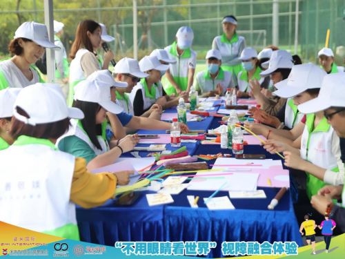 视障公益活动现场共设 “跑步 ”“ 声音 ”“手工” 三个主题,参与者们被分成英姿组、善音组、创媄组三组,通过不同的主题内容,让志愿者们参与到不同的盲视体验活动中。