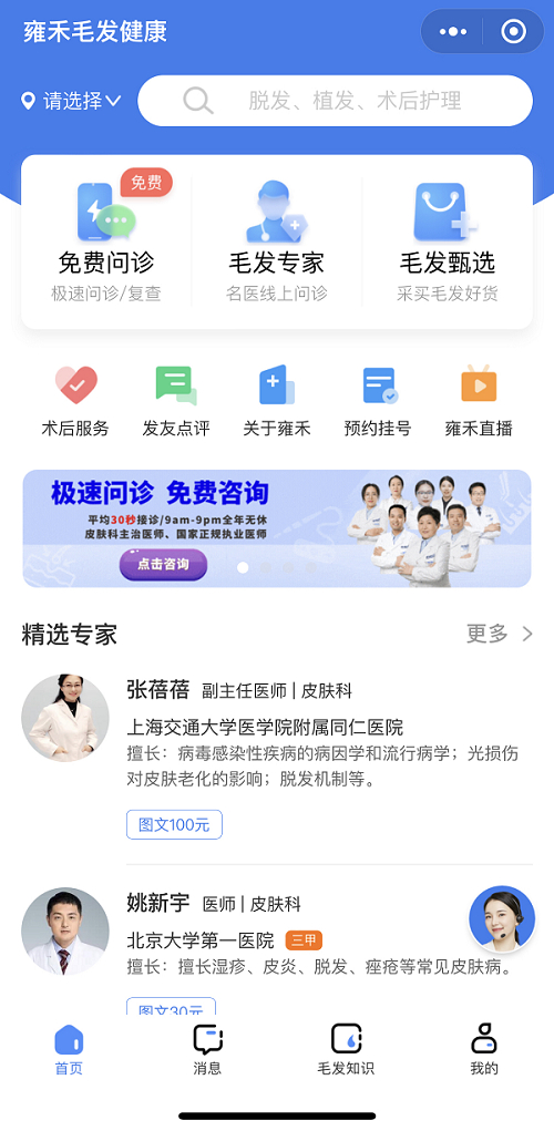 据悉,雍禾医疗旗下毛发互联网医院“雍禾毛发健康”已于3月21日在小程序端上线。“雍禾毛发健康”作为国内首家综合毛发互联网医院,将以患者为中心提供全生命周期的毛发医疗健康服务,可为发友提供线上咨询、一键挂号、术后复诊、电子病历、电子处方及云端药房等服务。