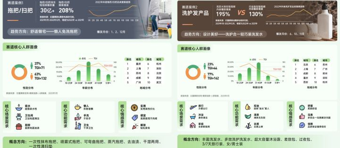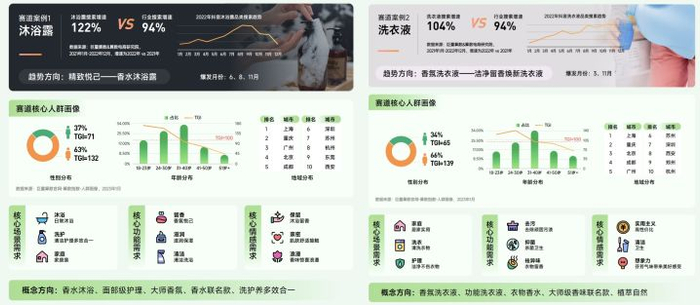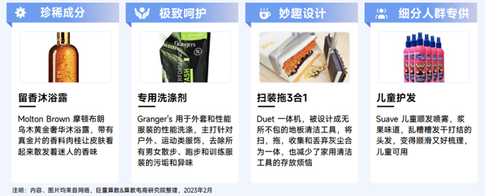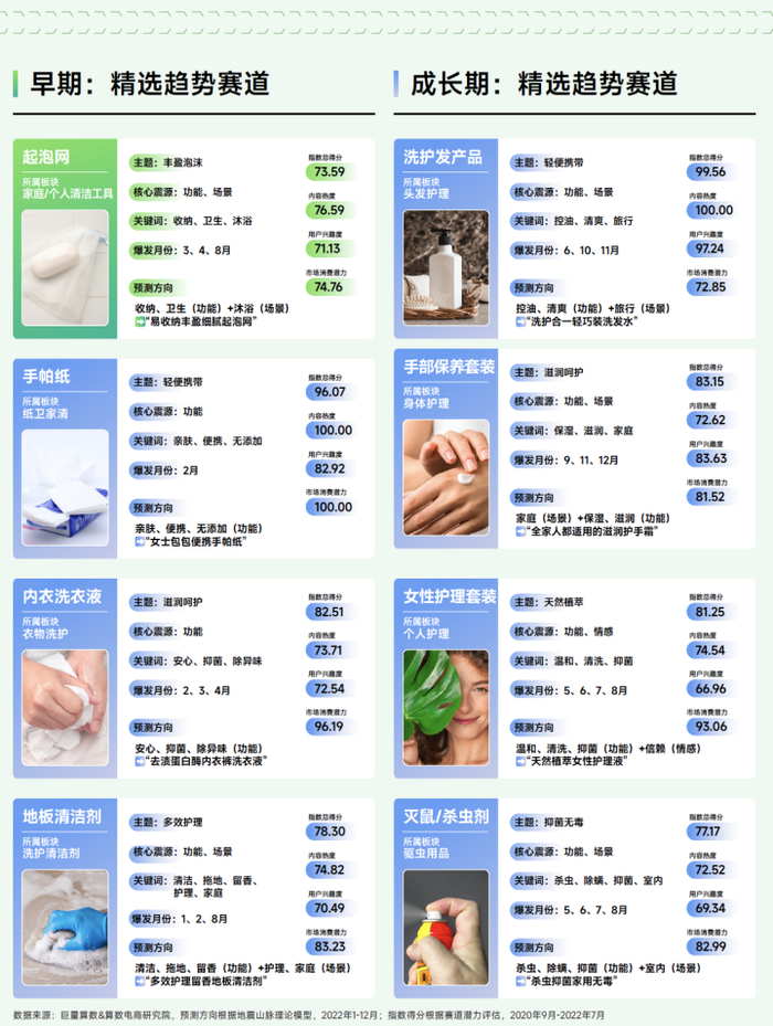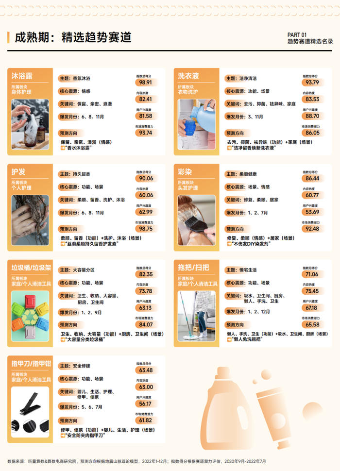 综合未来市场趋势赛道方向,主打黄金金片带有高端香的沐浴露,针对户外运动类服饰的性能洗涤剂,设计出奇的清扫工具和针对细分人群专供的护发喷雾,已上榜各爆款榜。