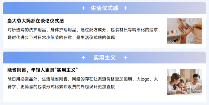 在情绪上,“生活仪式感”和“实用主义”中间平衡,情绪价值作为社交谈论热词,同样影响着行业趋势,对洗护用品、身体护理用品在包装材质、配方上的精细化追求,是生活仪式感的体现;绿色消费大环境下,大logo、大符字、更简易的包装形式相较繁琐浪费更加直接。