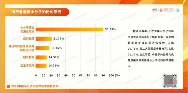 《2022小分子白皮书》显示,正在食用小分子奶粉的消费者选择小分子奶粉的第一大原因是“小分子蛋白”易消化吸收,占比90.73%;据了解,蛋白质是婴幼儿配方奶粉中最重要的成分之一,对婴幼儿的生长发育非常关键。普通牛奶粉的蛋白原始未经优化,分子较大,对于肠胃娇弱的婴幼儿来说难以消化,可能产生绿便、奶瓣、腹泻、积食、便秘等消化不良甚至过敏的症状。
