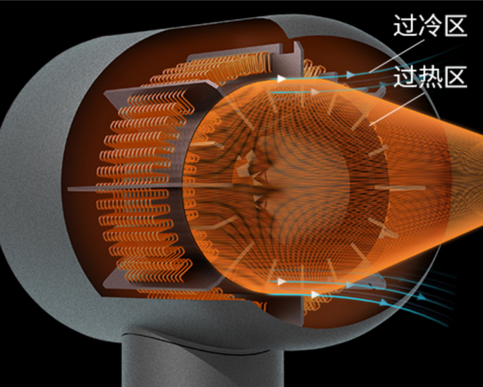 普通吹风机热点集中在出口处,过高的温度和长时间的吹风直接让头皮受损,还会对发质产生发黄、易断、分叉等不可逆转的伤害。