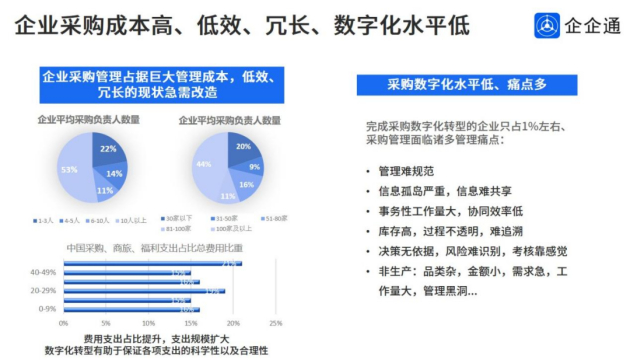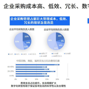 从采购数字化的角度来看,目前国内企业采购数字化渗透率不到10%,大概是在 7. 5% 左右。那说明大部分企业在这个采购管理过程中,因为没有数字化的支撑,所以整个信息无法那个共享,无法发挥到数字价值,而整个采购流程工作量也比较大,周期也比较长,库存高、成本高,不利于企业发展。