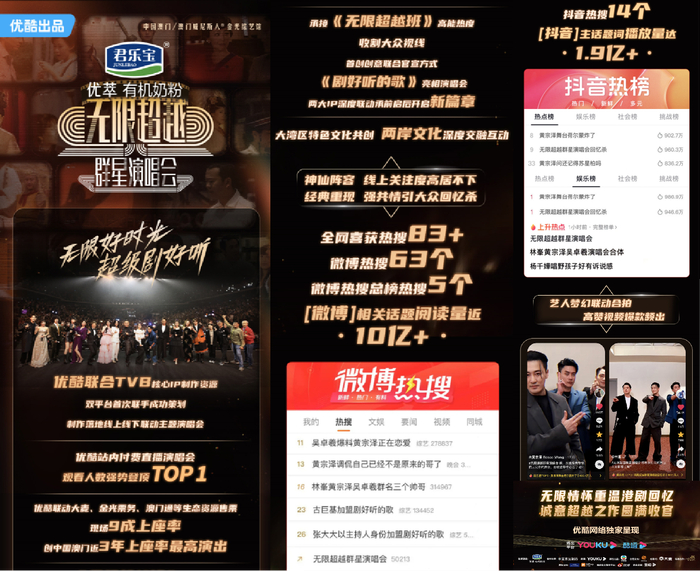 3月25日,由优酷、TVB、大麦、凤凰卫视联合出品的《无限超越群星演唱会》在中国澳门威尼斯人金光综艺馆成功举办。演唱会现场,杨千嬅、林峯、林保怡、陈慧珊等港星齐聚,将那段关于港剧和港乐的回忆与感动瞬间拉满,优酷首档全新OST音乐综艺《剧好听的歌》的现场超前官宣也引爆了用户对优酷综艺的期待。数据显示,这场演唱会狂揽全网热搜83+,微博相关话题阅读量近10亿+,抖音主话题播放量达1.9亿!