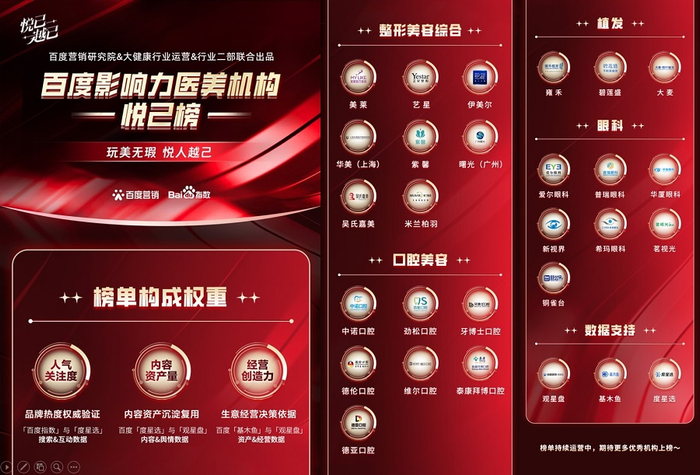 与此同时,为综合衡量医美机构影响力表现,对业界了解和甄选医美机构提供科学参考。百度营销正式揭晓《百度影响力医美机构——悦己榜》,从内容生产量、人气关注度、经营创造力三大维度,综合衡量医美机构在百度生态内的影响力表现,在具体的评估体系中,“内容生产量”代表的是,综合百度“度星选”与“观星盘”的内容、舆情数据等,评估医美机构的内容资产沉淀复用表现;“人气关注度”以“百度指数”和“度星选”搜索、互动数据为判定依据,验证品牌声量热度;“经营创造力”则是透过“基木鱼”与“观星盘”的品牌资产、经营数据表现,衡量医美机构的经营决策能力。