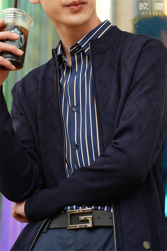 绝大多数职场男士都偏爱蓝色系穿搭,尤其是深蓝色、藏蓝色,比黑色少了几分沉闷厚重,又能兼顾成熟稳重的形象标签,风格百搭品位高级。欧度蓝白条纹衬衫搭配藏蓝针织外套、深蓝休闲裤,就是非常适合日常通勤的穿搭方案之一,穿着舒适感极佳,赋予人物干练气场。