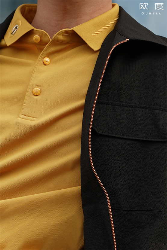 黑色夹克内搭欧度蛋黄色Polo衫,虽然两者都是经典基础款,但鲜明的色彩碰撞自然而然流露出阳光明媚的积极气息,视觉感受愉悦。Polo衫领部刺绣细节,平整扎实,突出衣物的品质感。气温回暖时,单穿Polo搭黑色直筒裤也很帅气。