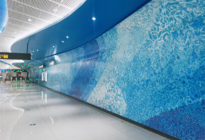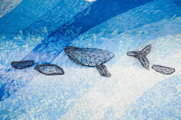 墙面采用半透明马赛克拼贴镶嵌,颜色渐变颇有湛蓝海水运动之感。钢网结构小饰品似鲸鱼、似海星、似礁石,独具海洋生态元素韵味。漫步其中仿佛游览三面环海的岛城,习习海风迎面而来。