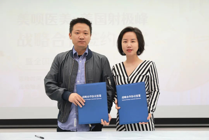 美呗医美副总裁徐乔和美国射极峰中国区市场总监余文婕出席了本次签约仪式,双方正式达成战略合作,将在业务互助、信息共享、产业互联网共探三大方面深化战略合作。
