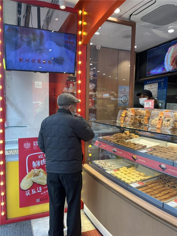 (图片说明:一位87岁苏州本地的老人,他说打自己记事儿起,就开始吃稻香村观前街店的糕点,一直到现在,只要路过观前街,都会来店里买上一些,说家里人都喜欢吃。老人的身影,让人感受到了老字号美食穿越时光的魅力!)