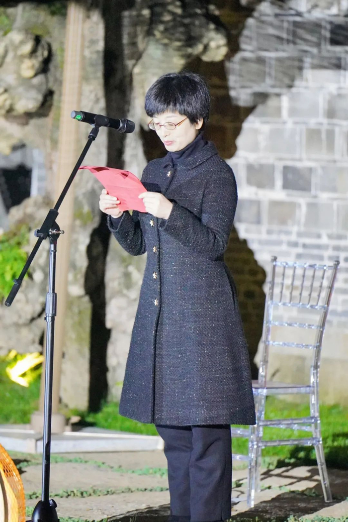 |宁波市文化广电旅游局局长詹荣胜先生致辞(左),宁波市江北区委常委、慈城镇党委书记余宁女士发布“慈城人文艺术生长计划”(右)