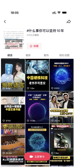 于是,勾勾互娱把李彦宏和百度的情怀不断放大,在抖音平台上用一个#什么事你可以坚持10年#的话题将之传递了出去。巧妙的是,话题之下的内容并非千篇一律的煽情,而是借着“杨紫琼成为奥斯卡影后”、 “中国的四大发明是什么”、 “拯救濒危语言”等时下热点及趣味话题,在吸引用户观看的同时巧妙地释放百度和李彦宏对AI的技术信仰,无形中建立起文心一言等于中国AI迎来爆发增长的强认知。