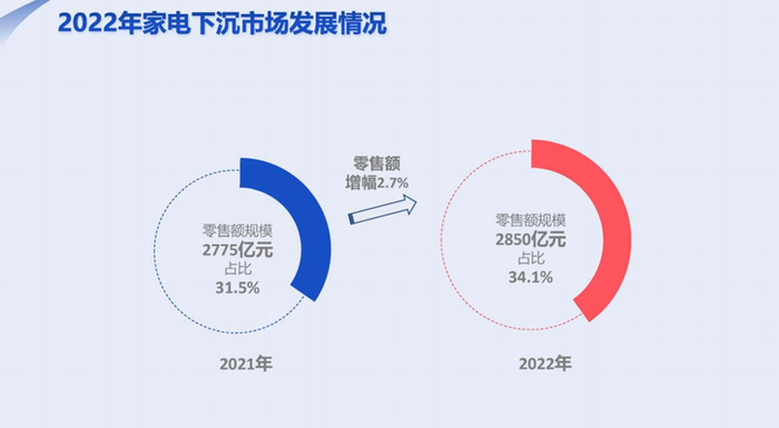 近年来,以电商为首的零售渠道不断向县乡下沉,释放市场消费潜力,减少消费鸿沟,也带动了家电销售。《报告》数据显示,2022年下沉家电市场逆势微增,零售额达到 2850 亿元,比上年增长2.7%,家电零售额占整体家电市场的比例由 31.5% 提升至 34.1%,在存量时代,下沉市场生发出了全新的生机。
