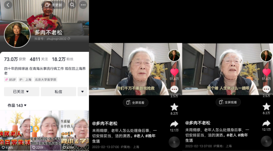 在抖音上,像朱锦沁奶奶这样的老年创作者还有很多。抖音等短视频应用,为当代老年人获取知识、社交娱乐、展示自我提供了新工具,加强了老年人的社会连接,增进了老年人在退出劳动力市场后的社会适应与社会参与,同时也为年轻人了解老年人群体的生活和想法提供了一个渠道。