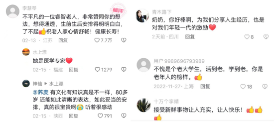 朱锦沁的抖音视频给很多年轻的网友打开了一扇了解过去,了解老一辈故事的窗口。网友说:奶奶的经历也激励着我们这一代年轻人。退休后的朱锦沁,通过互联网和短视频找到了新的乐趣,她在抖音注册了账号,还经常与网友们互动。除了让女儿帮忙在长视频里配字幕外,视频制作的大部分工作都由朱锦沁自己完成。活到老,学到老,是她一直秉持的人生态度。