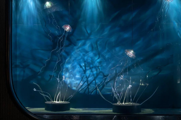 R&G的艺术家们希望通过灯光穿过水纹玻璃,在橱窗下方空间营造出水底光影效果。配合半透水纹图案玻璃贴,加强水面之上与水面之下视觉的差异和水下世界的身临其境。