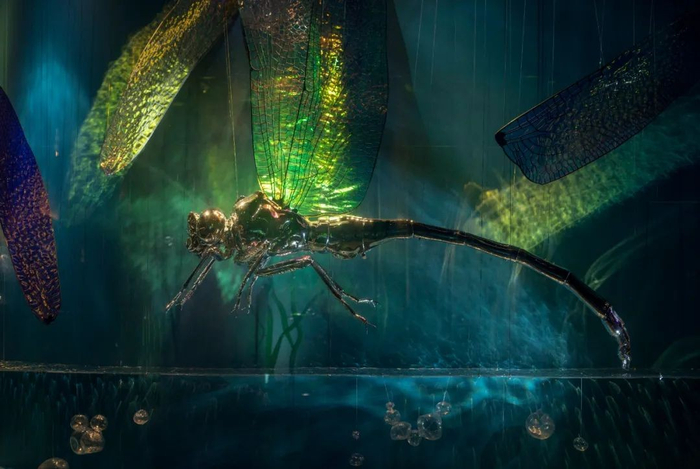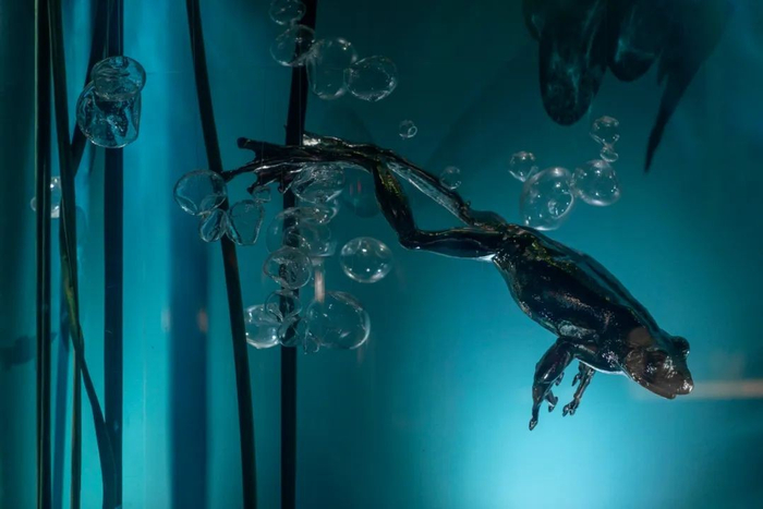 玻璃、光影、水世界的氛围感,在夜晚的加持下更加的真实灵动。在视觉上主要运用水作为视觉分界,选取了水面模拟了空间分界线,希望探讨不同维度与不同角度下,水上水下的生物不同且十分有趣的状态。