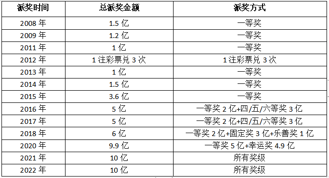 从派奖金额来看,可谓是一路升高,节节开花。2008至2014年,派奖金额基本在2亿元以内;2015年实现突破,派奖金额上涨至3.6亿元;2016至2017年,派奖金额均为5亿元;2018年因“乐善奖”的加入上调至6亿元;2020年则大幅上调至9.9亿元;2021年、2022年,大乐透派奖金额持续突破,达到10亿元,力度空前,且2022年派奖还新增了15周年特别奖。超级大乐透派奖频率高、力度大。上市第二年,就开始进行大派奖活动,一路为购彩者派送惊喜。