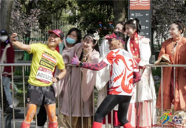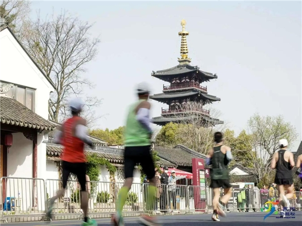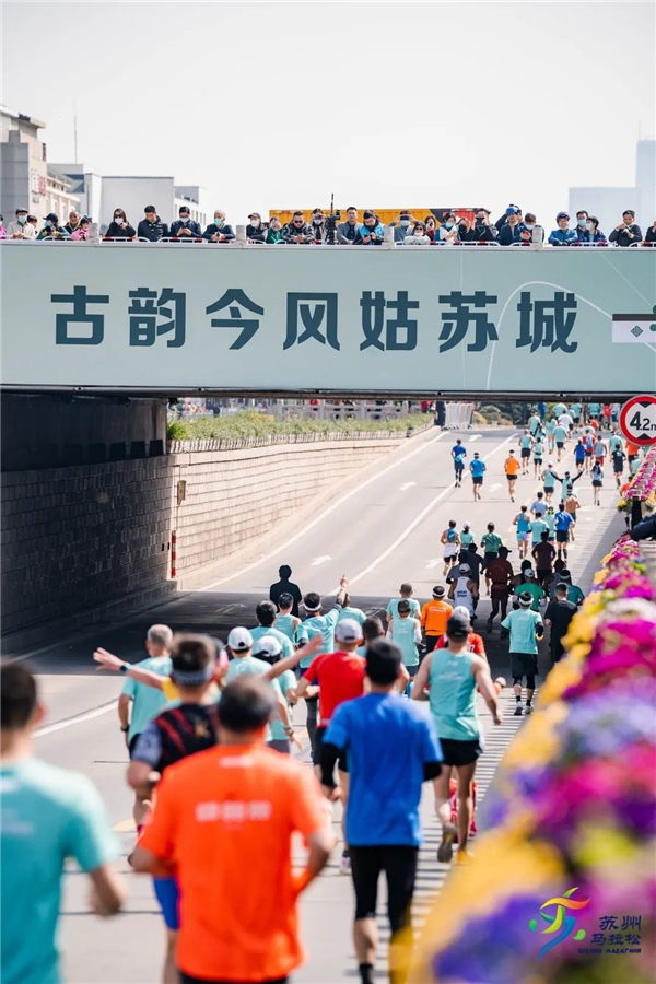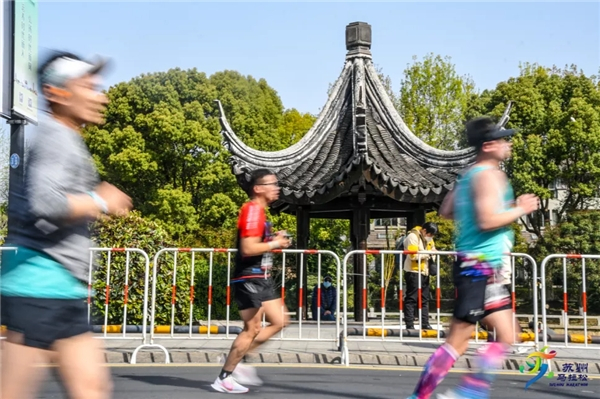 苏马的赛道设置充分体现了穿越千年文脉,感受古韵今风的特点,沿途经过护城河、大运河、金鸡湖等重要水系,寒山寺、西园寺、平江路、东方之门等古今苏州地标,石路、狮山、苏州中心、李公堤、圆融时代广场等繁华商业区,犹如一幅古今辉映的城市“双面绣”,无一不在向跑友们展示苏州2500年的悠久历史文化和“强富美高”的崭新图景。三月下旬正是江南草长莺飞,满城花开的最美时刻,跑友们全程沉浸式地奔跑在江南春色中。
