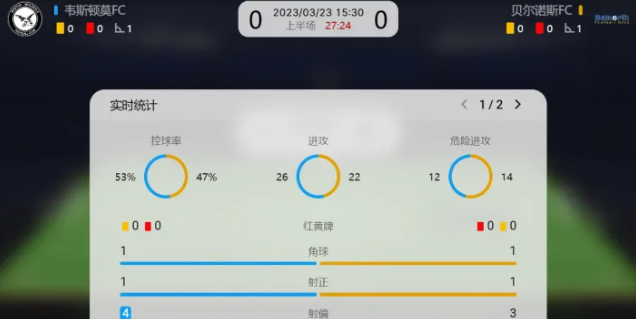 在新版动画中,我们在界面的右下角还新增了“指数”、“统计”等数据。方便更多不同需求的用户在观看比赛时获取到更多的信息以及本场比赛相关的详细数据,如控球率、角球、红黄牌等。