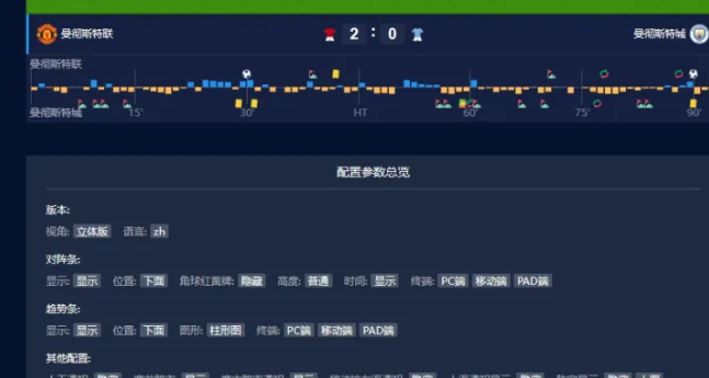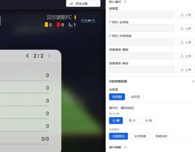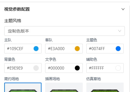 在视觉参数配置界面,我们提供了包括主队、客队、主题色、背景色等不同颜色样式的更改,包括比赛场地我们也有三种样式可以选择。